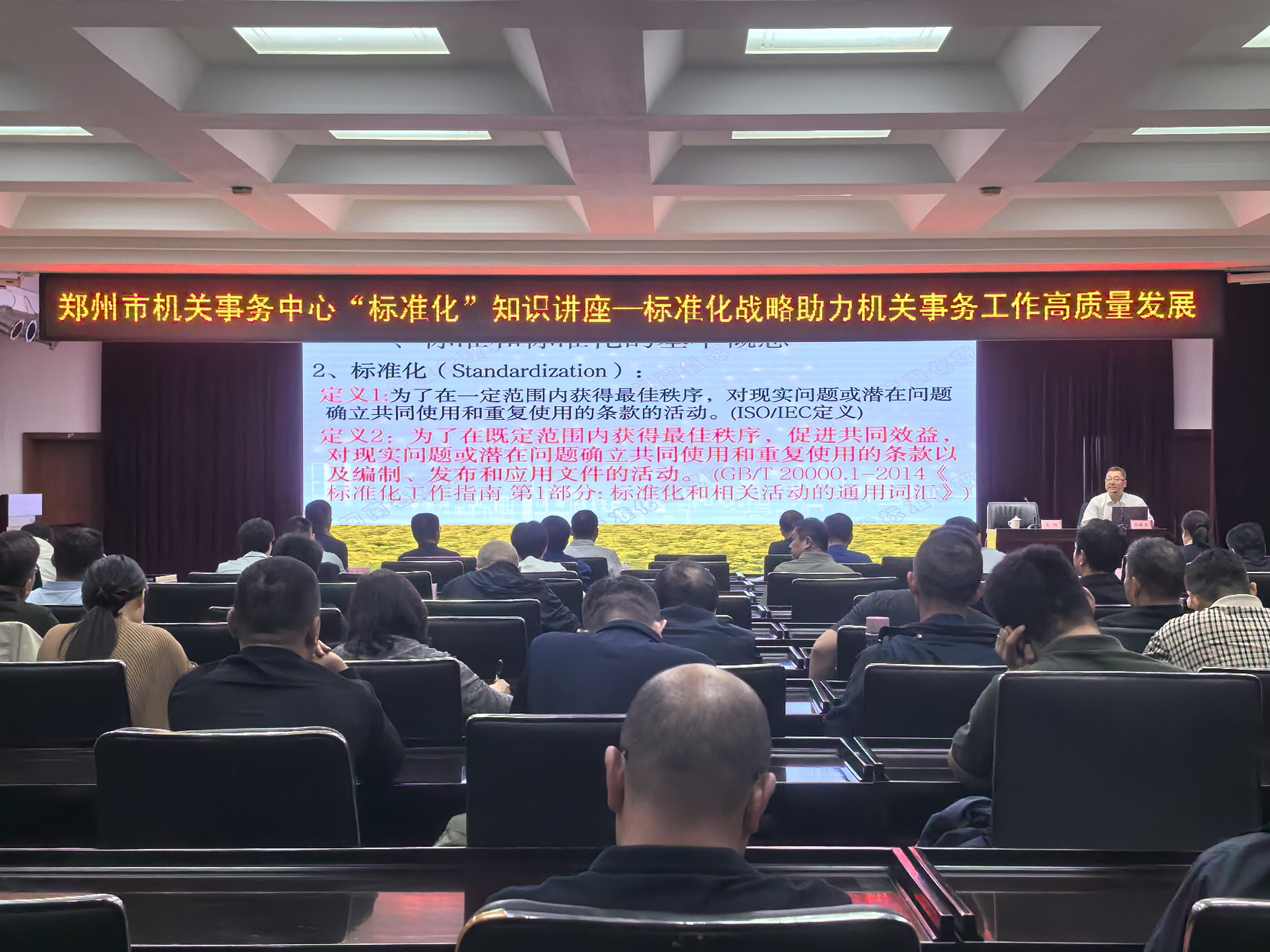 为深入推进机关事务标准化建设,扎实做好省级标准化试点验收准备工作,9月18日下午,郑州市机关事务中心特邀河南省标准化和质量研究院郭敬东教授,在保障中心4楼会议室举办“标准化战略助力机关事务工作高质量发展”专题培训会。会议由中心副主任孟翔主持,中心及所属机构干部职工100余人参加。